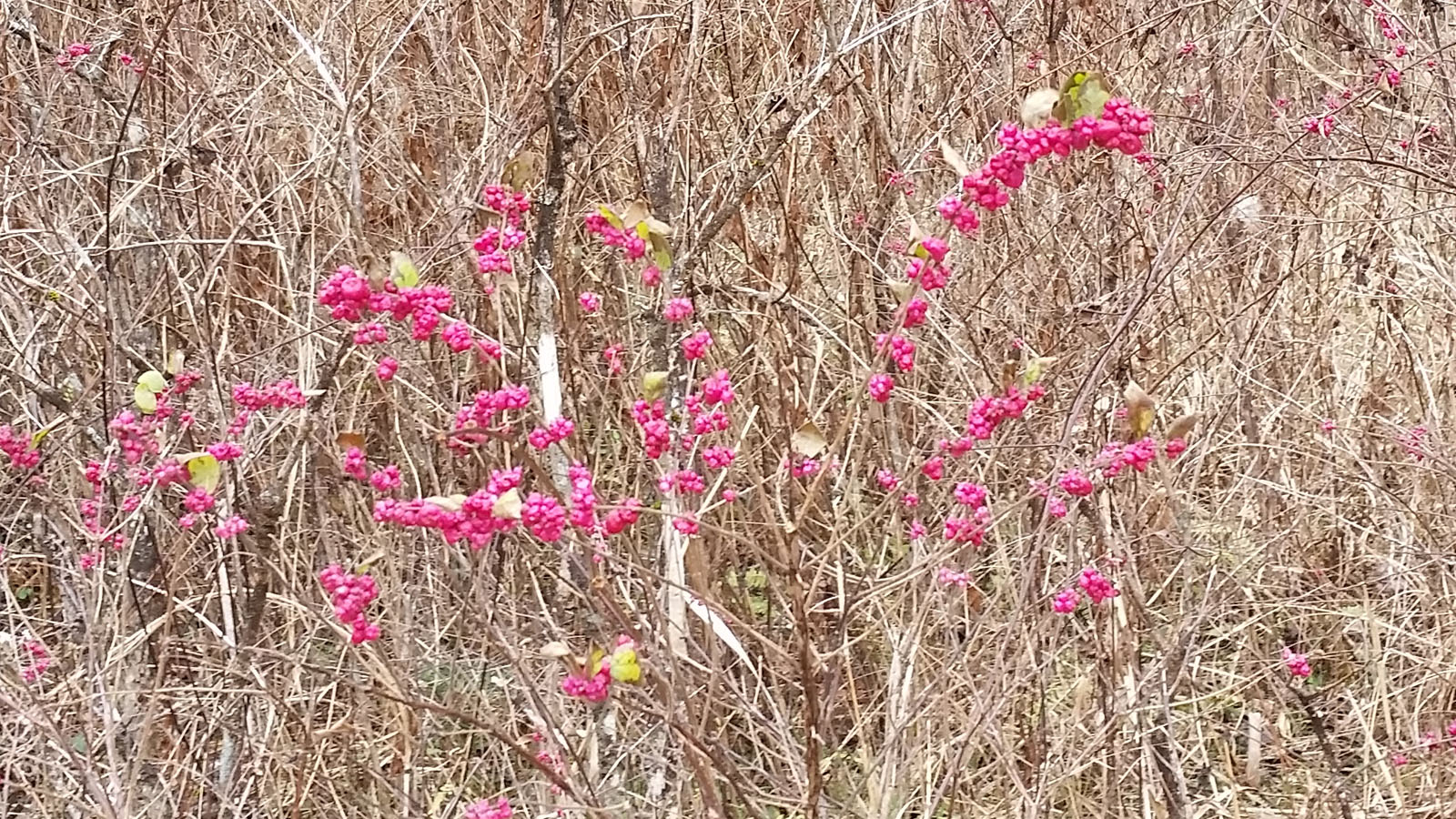 What do you think this shrub is? Brilliant show of bright pink berries spotted near the intersection of Cat Gap loop and Butter Gap trails at Picklesimer Fields, 11/16/15. Submitted by Penny.
