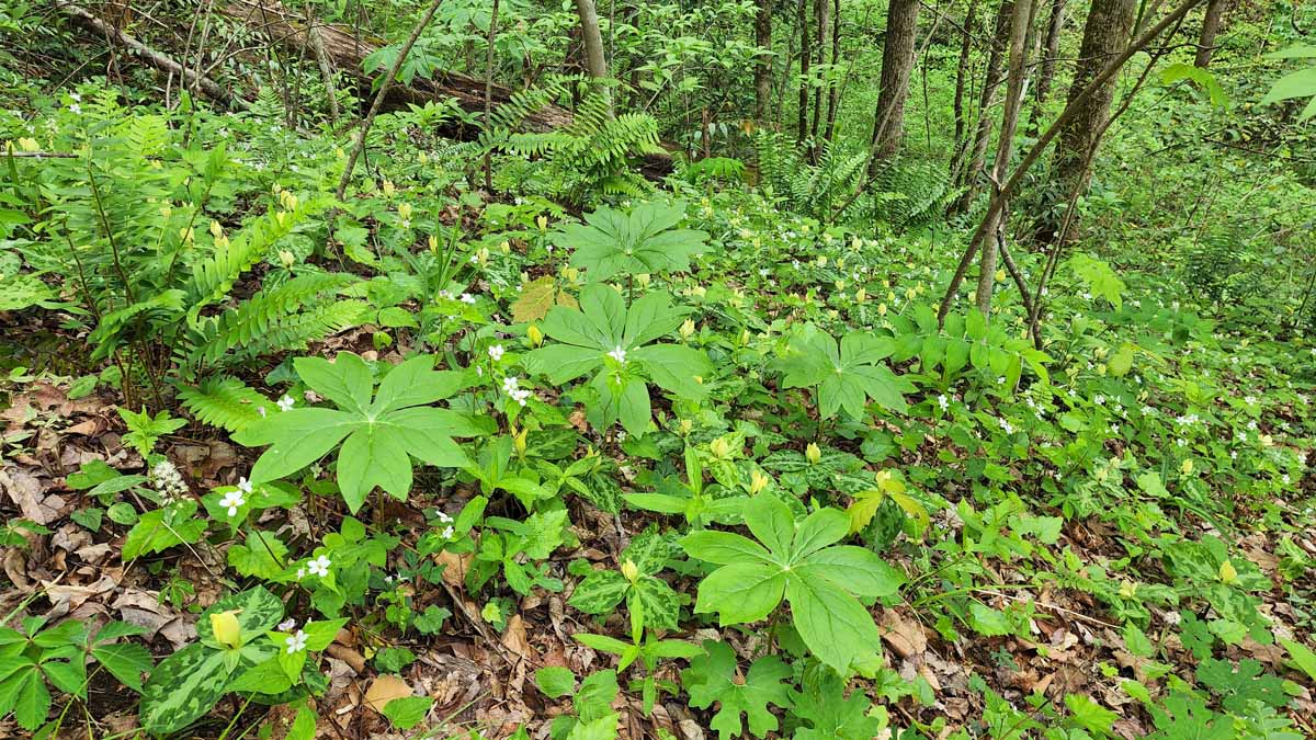 May Apple; Mandrake (Podophyllum peltatum) & Pale Yellow Trillium (Trillium discolor)