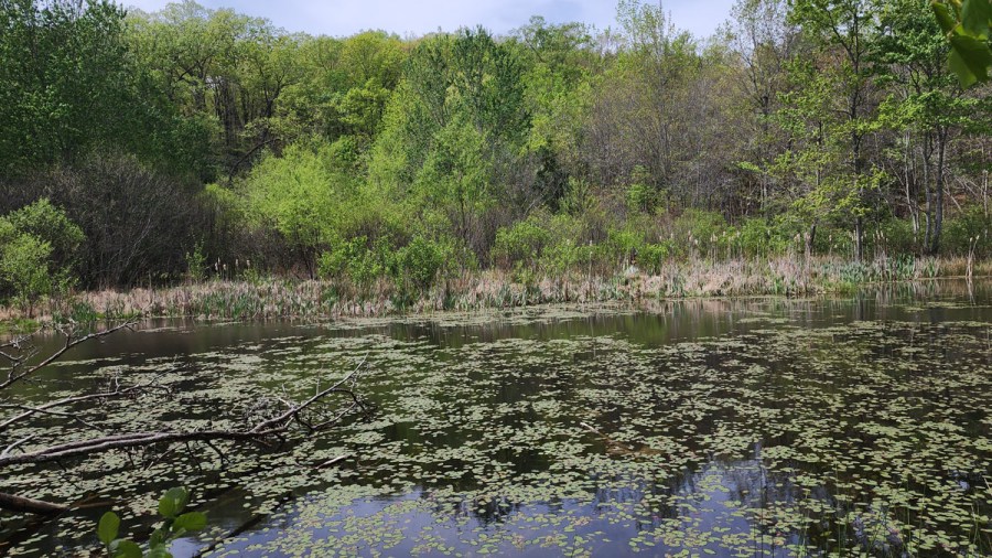 Water Shield (Brasenia schreberi) & Narrow-leaved Cat-tail (Typha angustifolia)